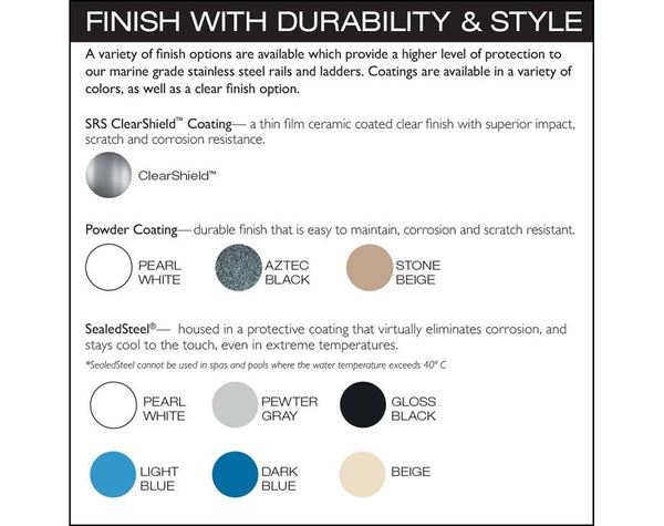 The Deck Mounted Stair Rail is suitable for use on pool stairs and sloped entries. Constructed of 316L Marine Grade Stainless Steel. A variety of finish options available: power coating, vinyl coating or a clear coat. See brochure for more details.
