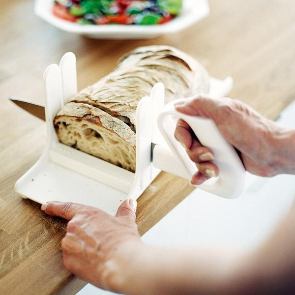Etac Cut Cutting Aid [80501005] simplifies slicing bread, paté, a steak or whatever is to be cut. By turning the transverse bar, the thickness of the slices is easily changed. A knife fits in the guides, which makes it possible to cut safe and straight. An invaluable help to compensate impaired sight.