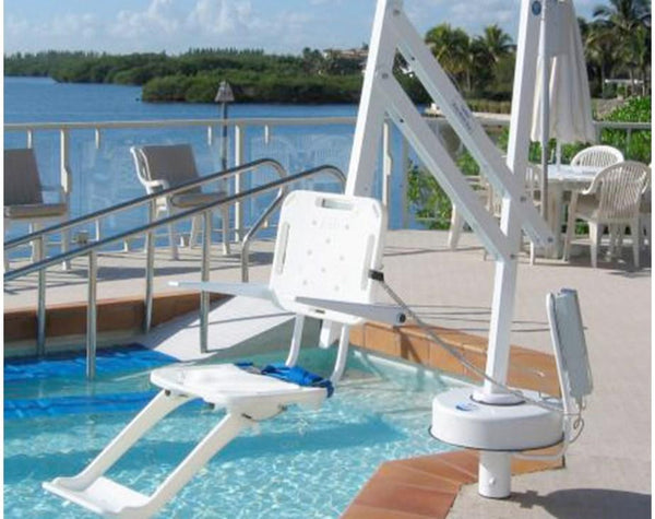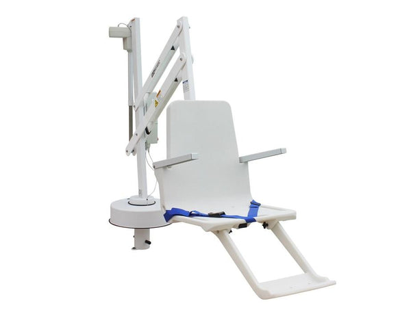 The Splash! Lift installs into your pool deck via anchor, and can be easily removed with the included caddy. 344° rotation ensures a safe transfer area. Standard features include the LiftOperator Intelligent Control, a 24-vold rechargeable battery, waterproof hand control, armrests, footrest, seatbelt assembly, and caddy.