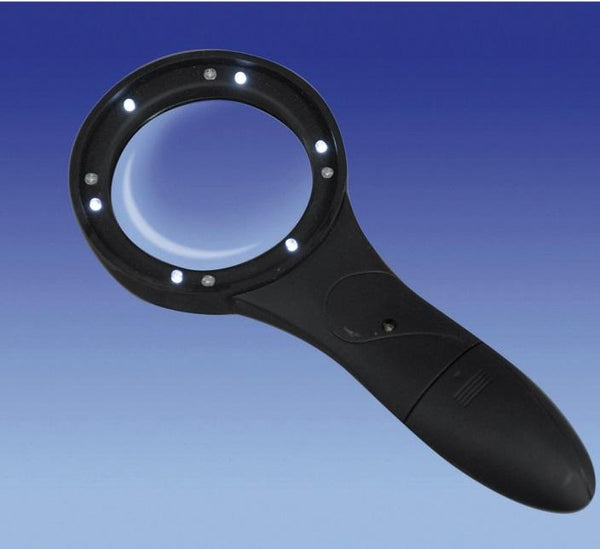 Magnifier Handheld With Led Lights [Vm966M] is a a deluxe handheld Magnifying Glass with 6 high output LED lights for reading, hobbies, crafts, maps, etc. A great magnifying glass for travel or situations where the light is subdued.