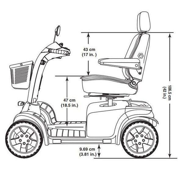 1 Varies with user weight, terrain type, battery amp-hour (AH), battery charge, battery condition and tyre condition. This specification can be subject to a variance of (+ or -) 10%. 2 Due to manufacturing tolerances and continual product improvement, this specification can be subject to a variance of (+ or - 3%). 3 AGM or gel cell type required. 4 Tested in accordance with ANSI/RESNA, WC Vol2, section 4 & ISO 7176-4 standards. Results derived from theoretical calculations based on battery specifications and drive system performance test conducted at maximum weight capacity. 5 Includes standard seat. 6 Battery weight may vary based on manufacturer. NOTE: This product conforms to all applicable ANSI/RESNA testing requirements and ISO 7176 series EN12184 standards. All specifications subject to change without notice.