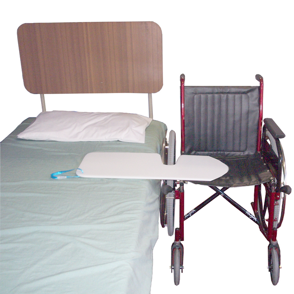 Used to slide from wheelchair to car, bed, chair, etc. The cut-out is placed around the wheelchair wheel so the board covers more of the seat of the wheelchair. Can be used with a Slide Pad, Handi Lift Walk Belt, Soft Transfer Belt or Car Roller Sheet. This Poly material will bend, but will not break. It is a strong, self lubricating material. The outer surface may mark easily and a new board may look second hand when new, but the advantages of using this material outweighs the disadvantages.